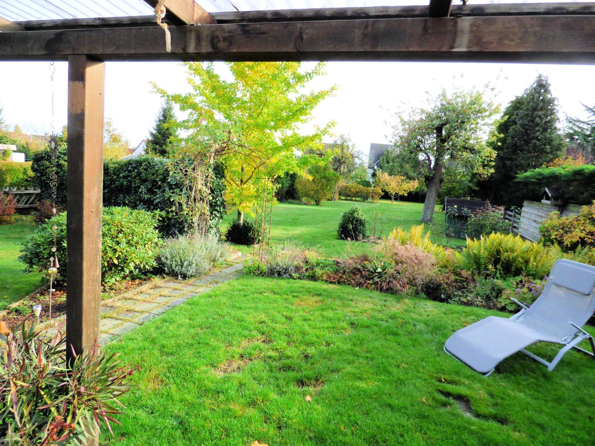Das große Grundstück bietet Platz für diverse Spielgeräte oder kann für den Anbau von eigenen Lebensmitteln umgestaltet werden, zwei Obstbäume sind bereits vorhanden.