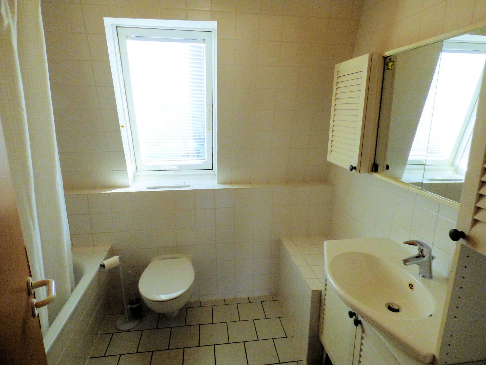 Das Badezimmer mit Fenster im OG des Haupthauses ist mit Badewanne, Waschbecken und WC ausgestattet. Die Wände sind deckenhoch gefliest.
