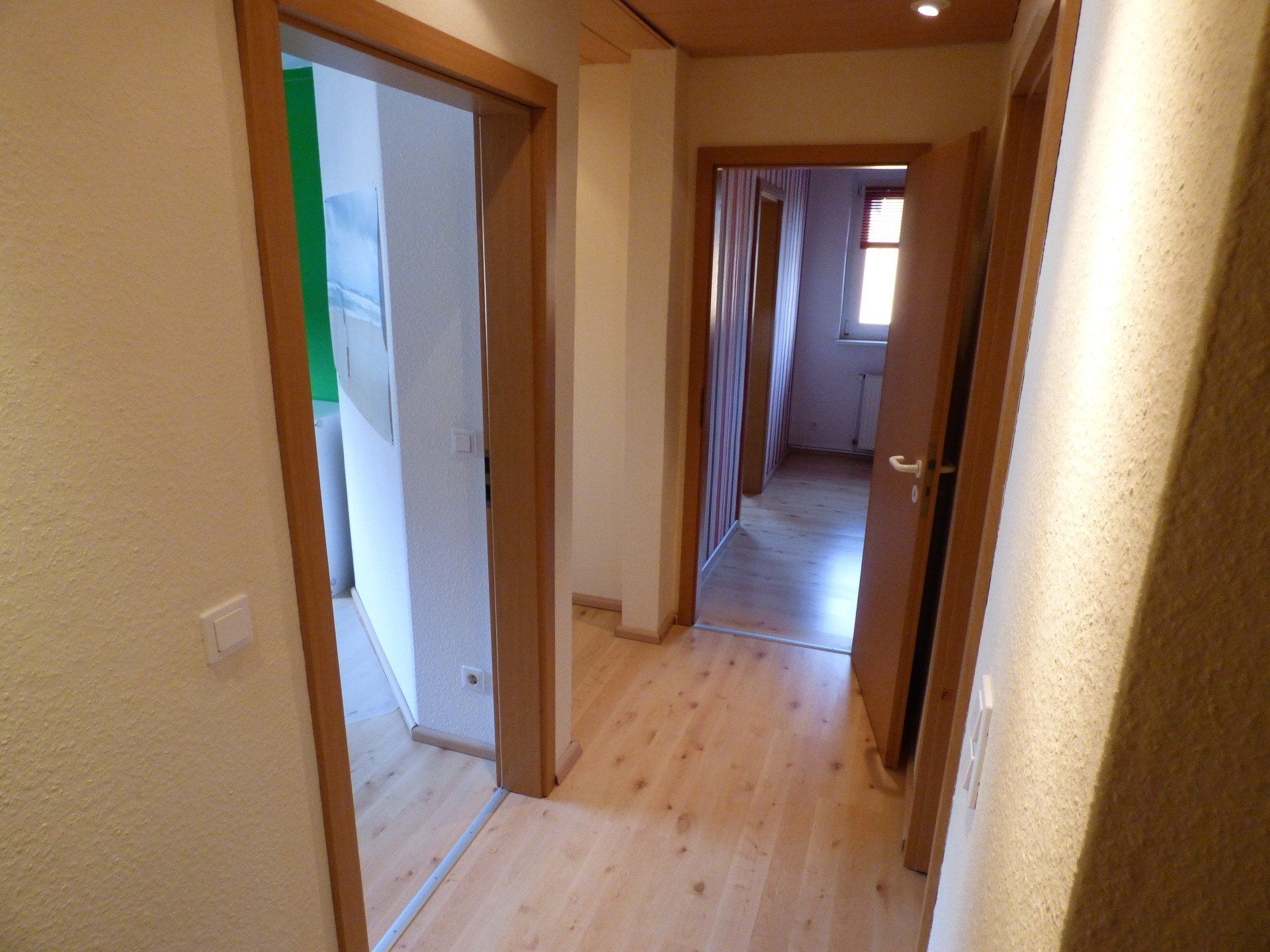 Der Fußboden im unteren Flurbereich sowie in der Küche ist mit einem neutralen Fliesenbelag versehen, im Wohnzimmer sowie in den Schlafräumen ist Laminatbelag vorhanden. Sämtliche Wände sind mit Raufaser tapeziert und gestrichen.