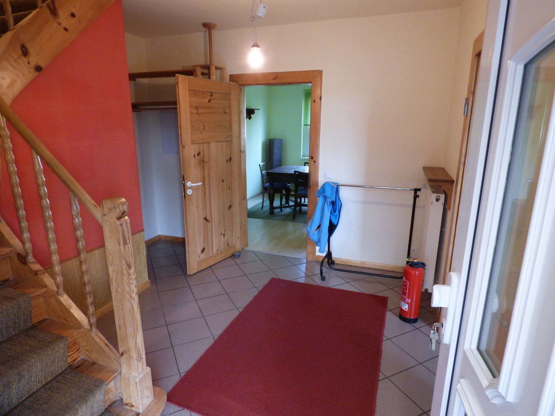 Die Innenräume sind mit diversen Holzelementen, u.a. massiven Holztüren sowie einer Raumspartreppe versehen, die Decken verfügen teilweise über Holzvertäfelungen.